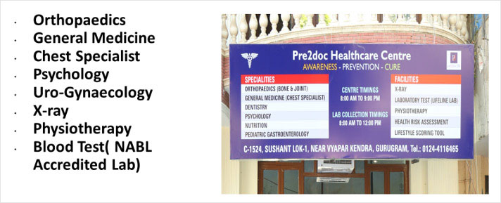 Pre2doc Healthcare Centre is a Multi-Speciality centre in Sushant Lok I, Gurgaon. The clinic offers Orthopaedics, General Medicine, Pulmonology, Psychology, Uro -Gynaecology, X-Ray, Physiotherapy, Blood Tests Services with NABL Accredited lab.